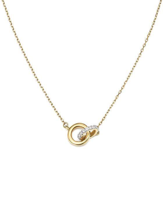 Colier delicat din aur galben, cu un pandantiv format din două cercuri interconectate, dintre care unul este decorat cu mici pietre strălucitoare.