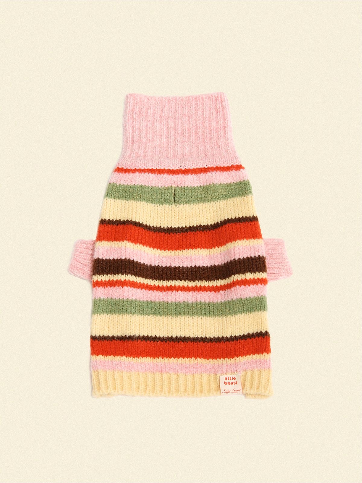Pulover călduros și confortabil pentru câini, realizat din material tricotat moale, cu design colorat în dungi pastel. Ideal pentru plimbările din sezonul rece.